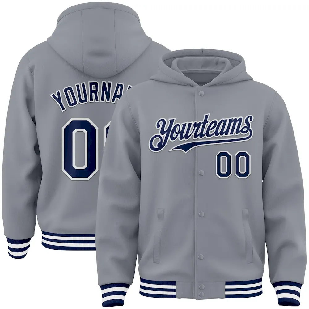 €38.99Custom Gray Navy-White Bomber Full-Snap Varsity Letterman Hoodie Jacket