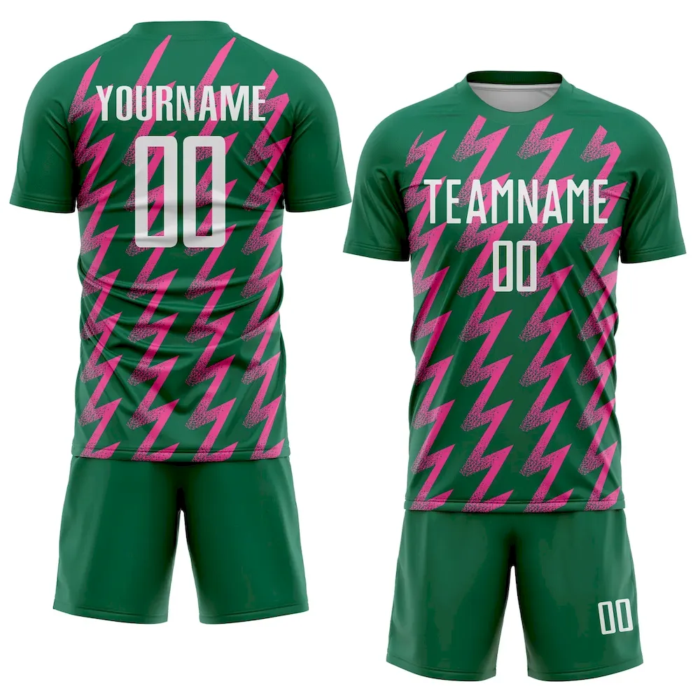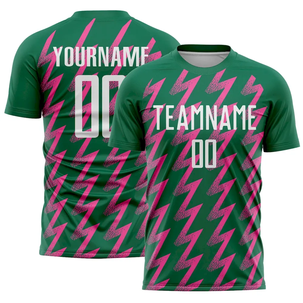€25.29Custom Kelly Green White-Pink Zigzag Shape Sublimation Soccer Uniform Jersey