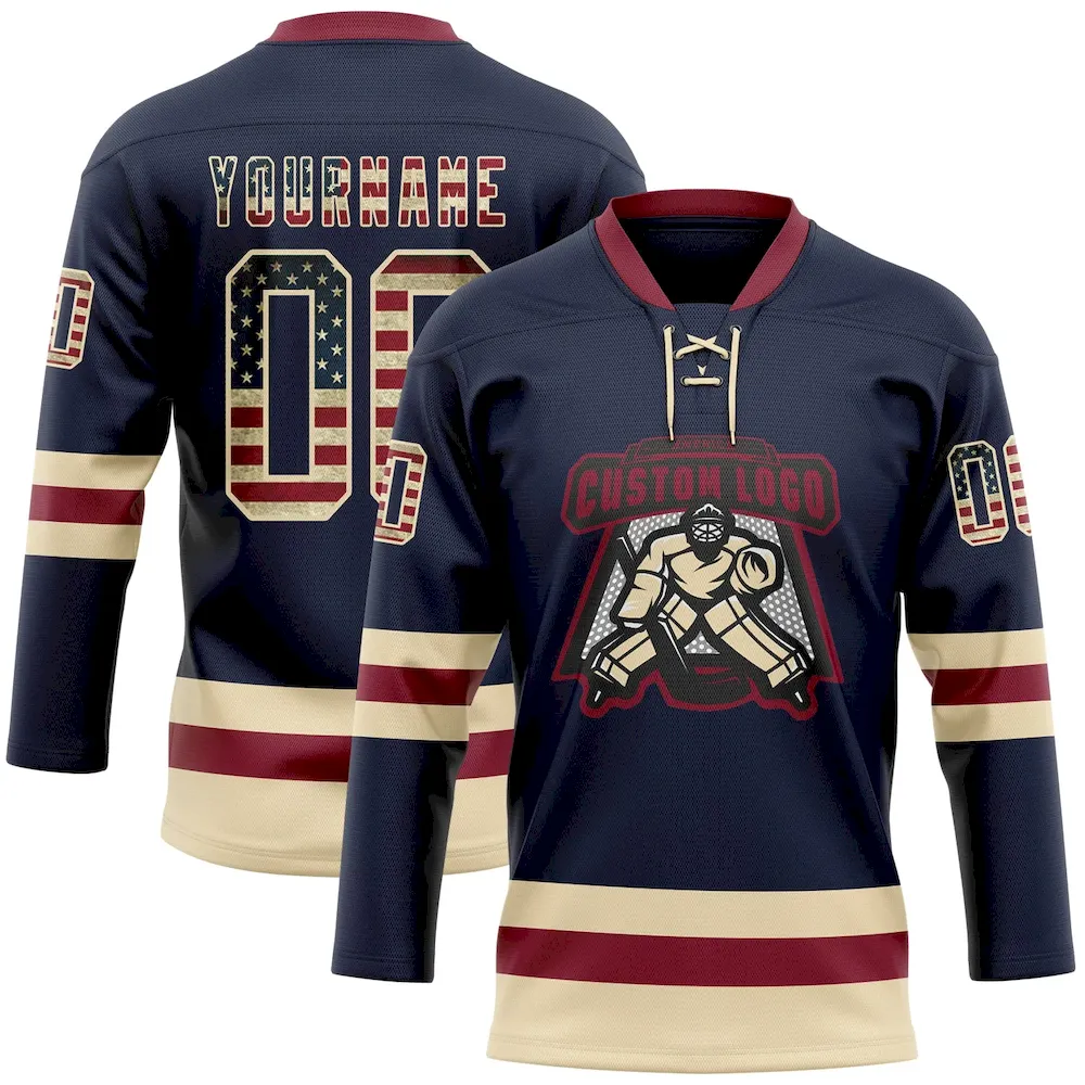 Custom Navy Vintage USA Flag Cream-Crimson Hockey Lace Neck Jersey