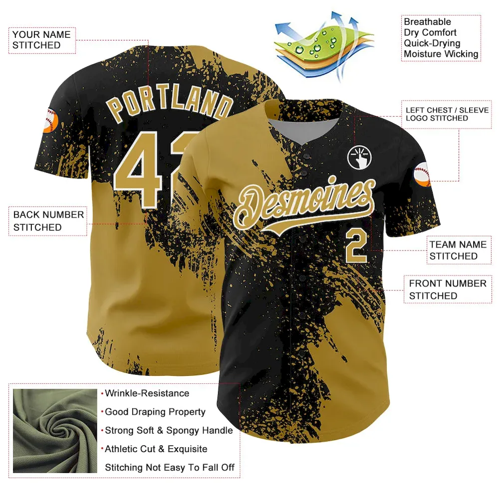 Custom Old Gold Black-White 3D Pattern Design Abstract Brush Stroke Authentic Baseball Jersey